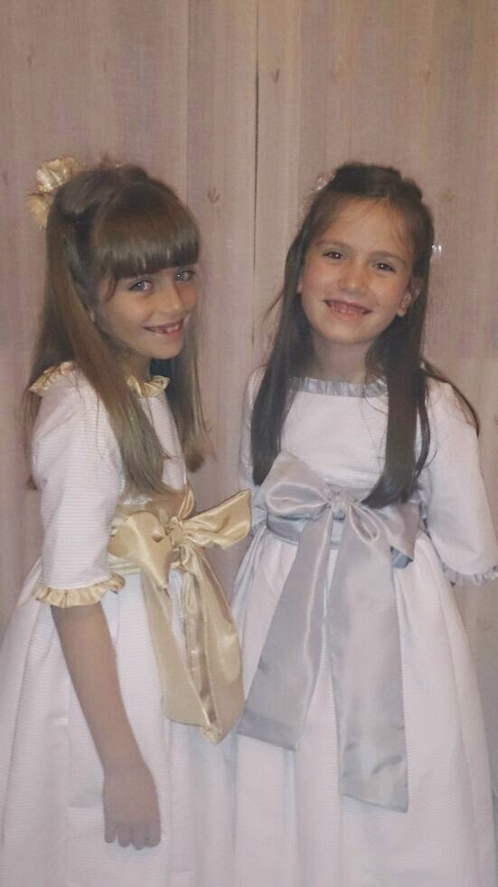 Claudia y Lucía de plata y oro. Ayer tuvieron su Primera Comunión en Murcia. Un día estupendo, las niñas guapísimas no recibieron más que piropos. Llevan el modelo Biarritz en otomán y seda champán y plata. Guapísimas !!!!!!
